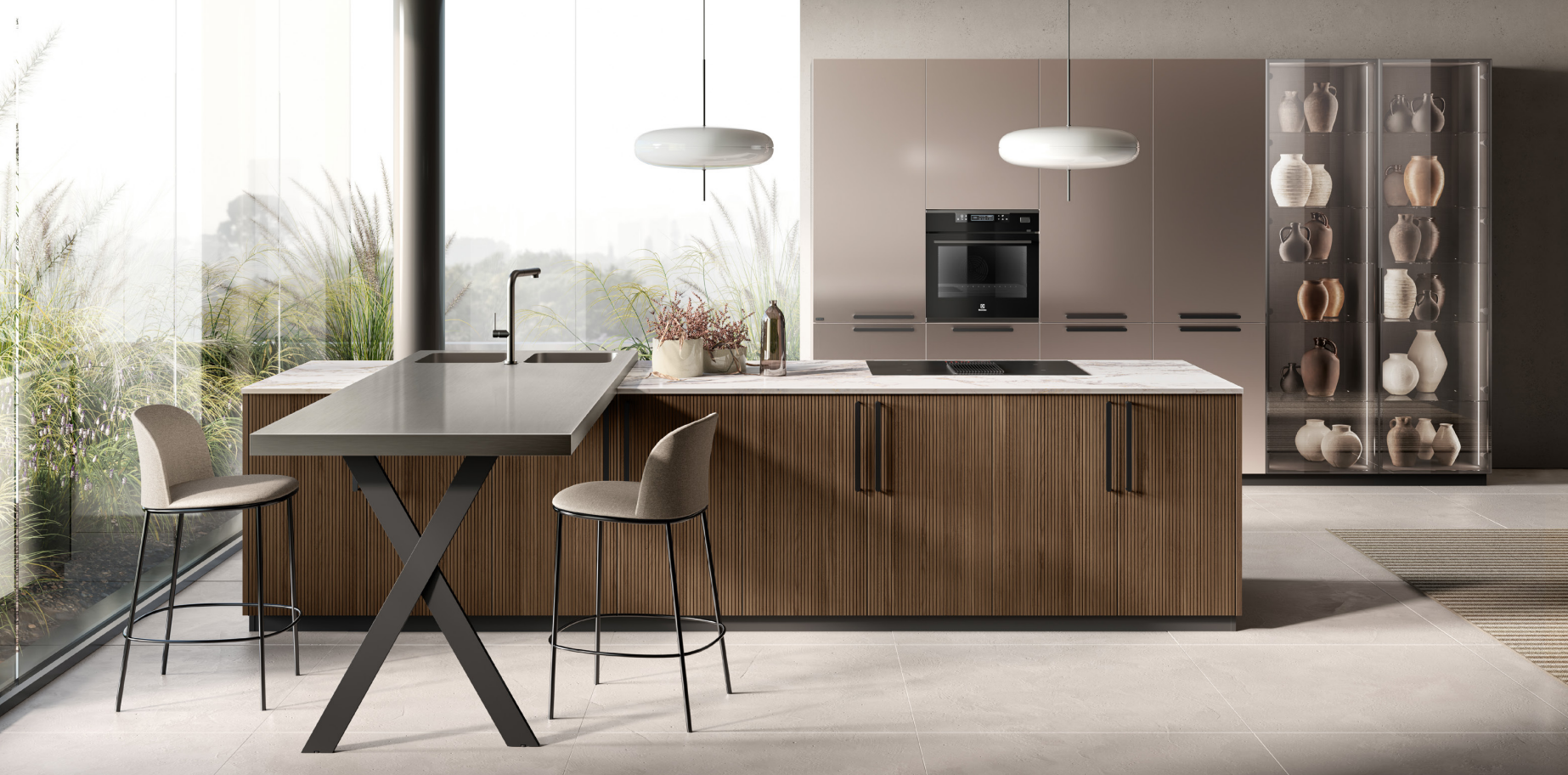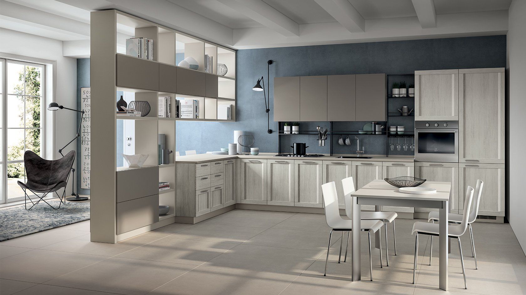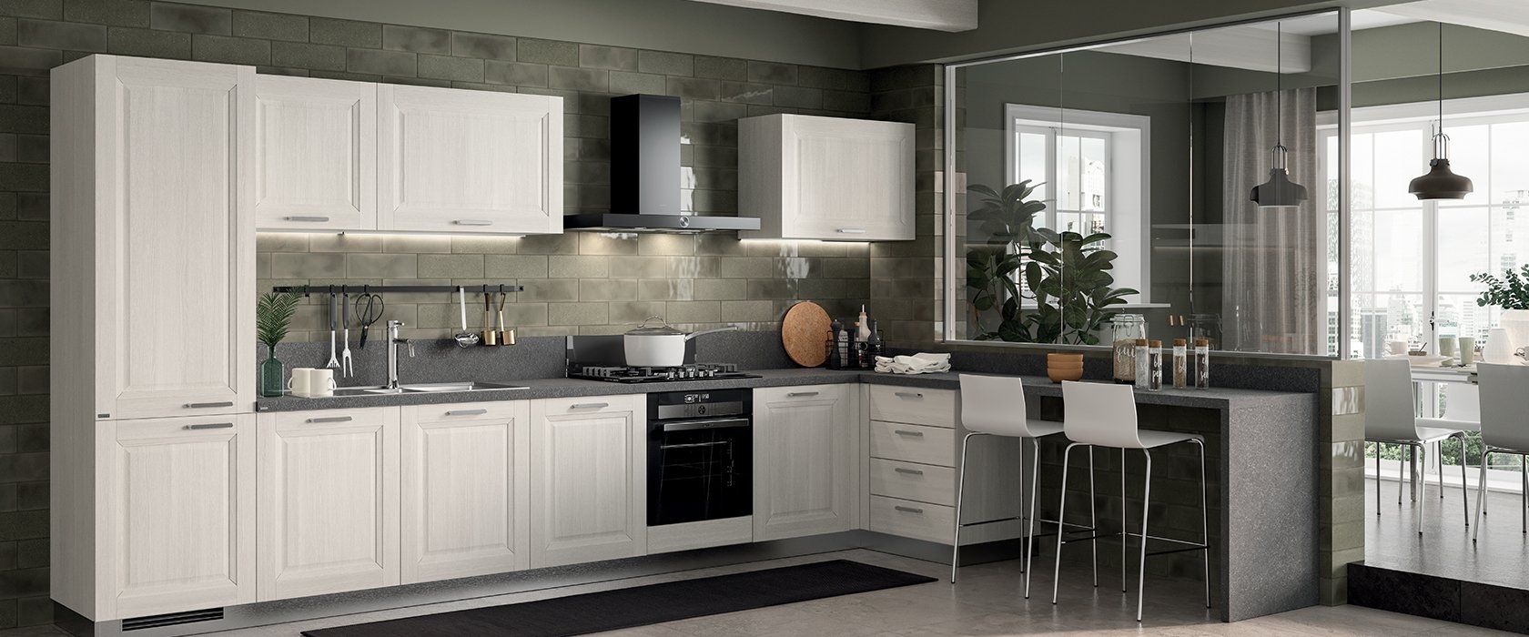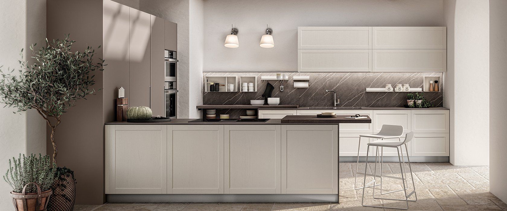 La sua caratteristica principale è l’anta telaio con bugna che dona alla cucina un’atmosfera calorosa e appunto familiare.